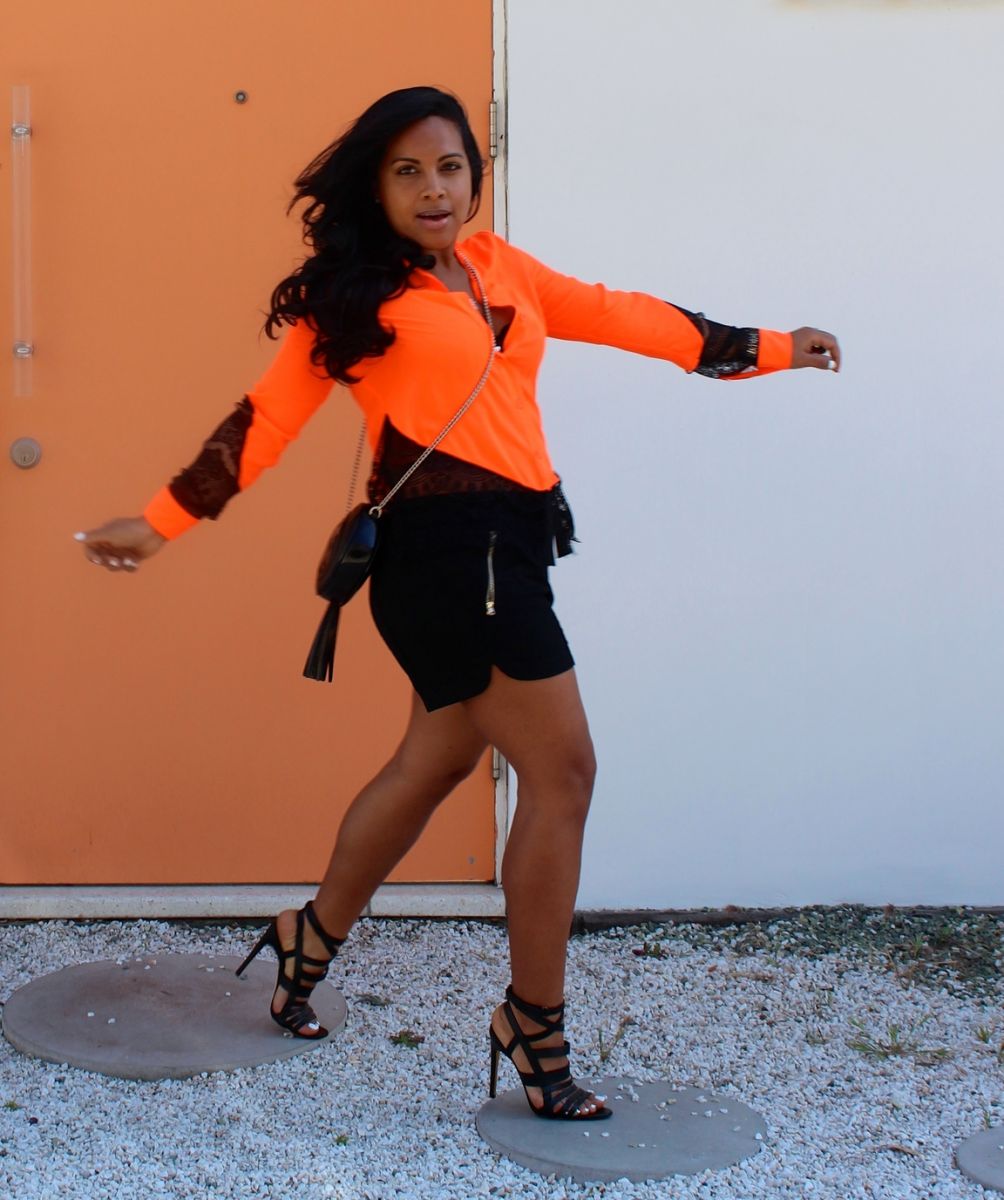 Wearing: Neon Orange Top (alternative here, here), Black Shorts (and here, here), Rupert Sanderson Heels, Gucci Bag.