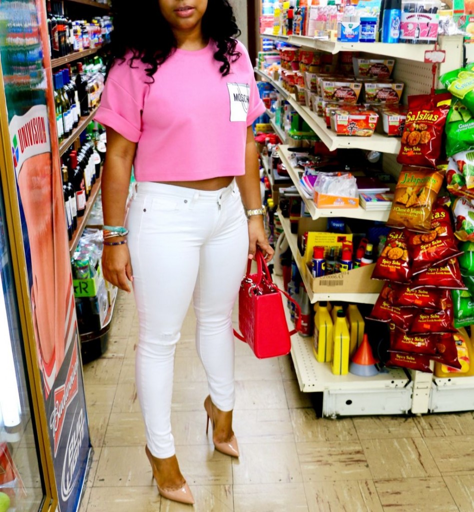 snake print jeans and a white tee