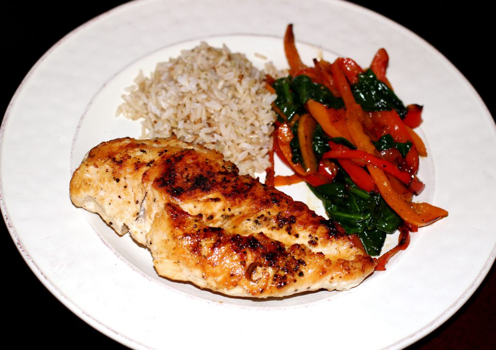 season with salt, lemon pepper. add to the same grill, red/orange bell peppers and spinach. I added left over brown rice from the night before. Easy! Have a great weekend!