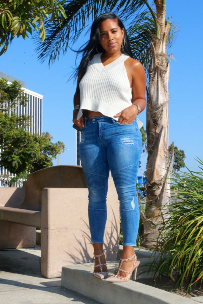 Distressed Motorcycle Jeans + Sleeveless Sweater