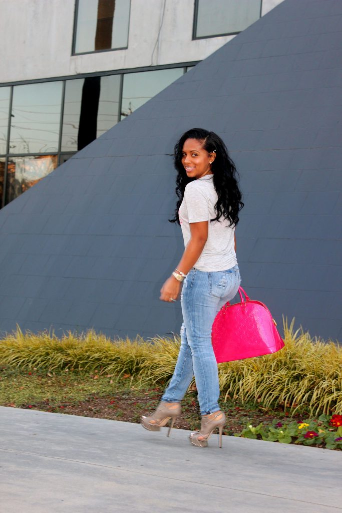 Wearing: Gucci T-Shirt, Current Elliot Jeans, Camilla Skovgaard Heels, LV Bag.