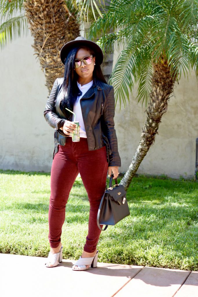 Shop Here: Jacket {alternative here, here, here and here} | All Saints Tee Here | Velvet Pants here | Heels {alternative here, and here} | Perrier lime sparkling water is my fav! | Hat.